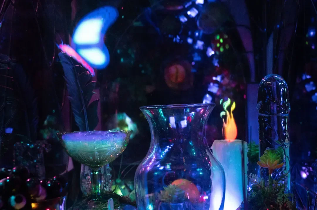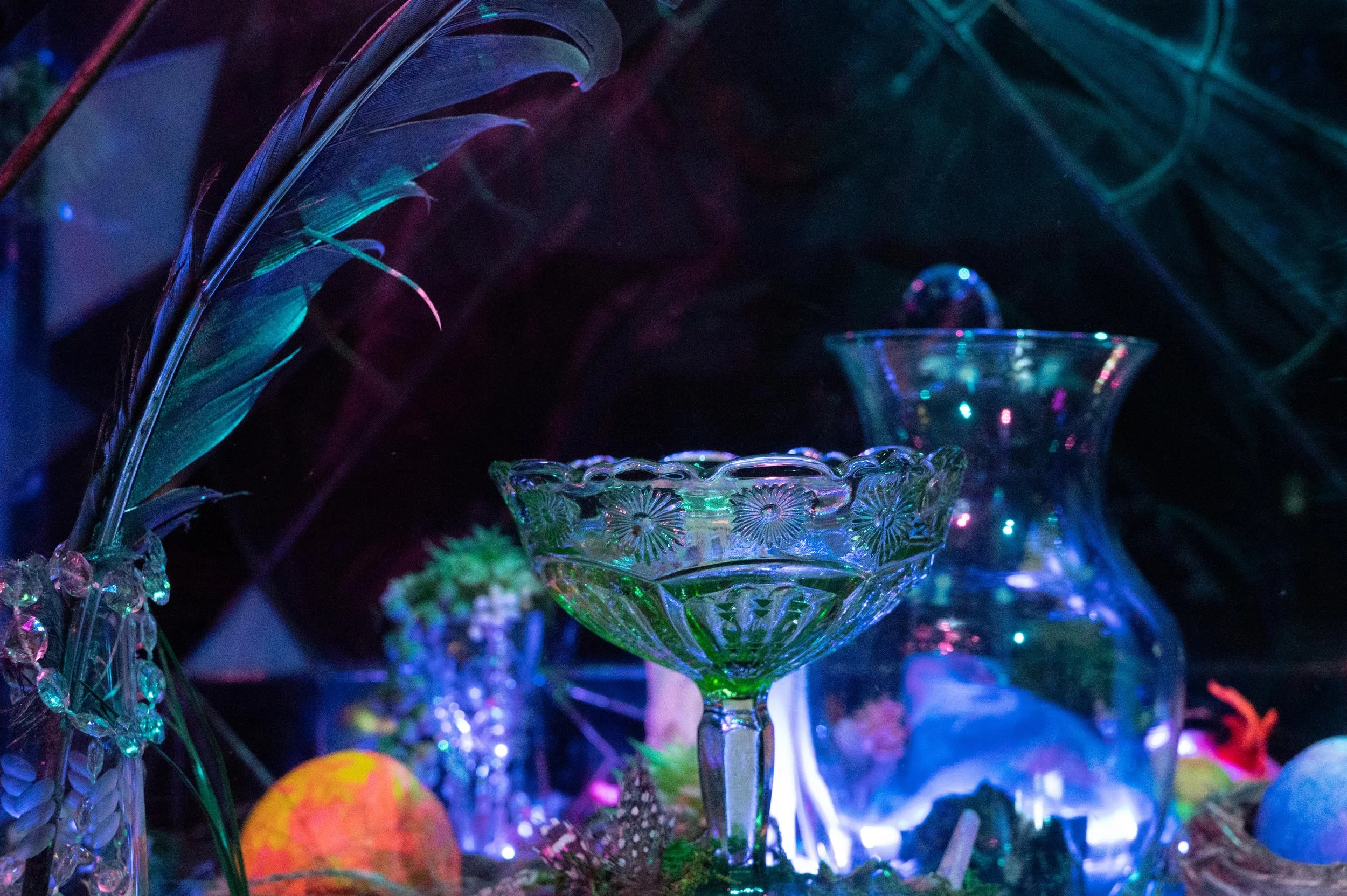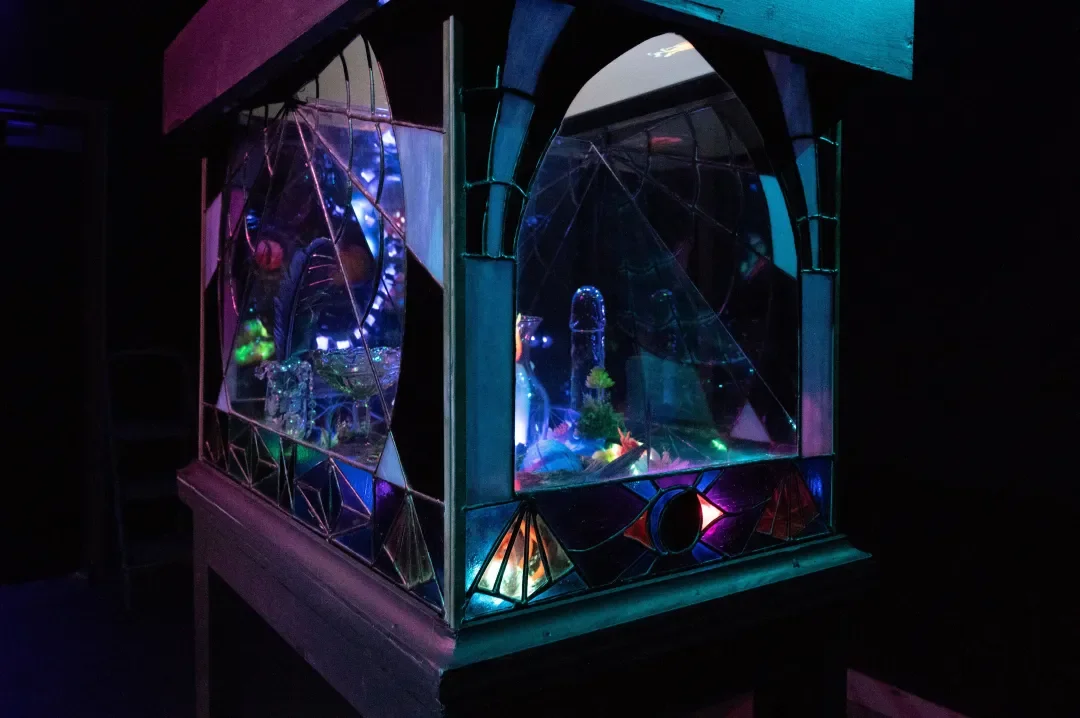 Butterfly FX is somewhere between a terrarium and a reliquary. The work offers a reflection on these two traditions of containment: the terrarium as an attempt to contain the wild, and the reliquary as an attempt to capture the metaphysical within the material. This particular stained-glass box contains a fantasy ecosystem in which fluorescent cartoons, fetish objects, and cheap craft materials writhe in a bioluminescent garden. Animated creatures traverse through egg-portals and create elixirs, an ice-phallus blooms with spring flowers, and guardian butterflies watch over the situation. Symmetrical planes of reflective glass frame the activity and refract the light toward an ambiguous space beyond the container.
