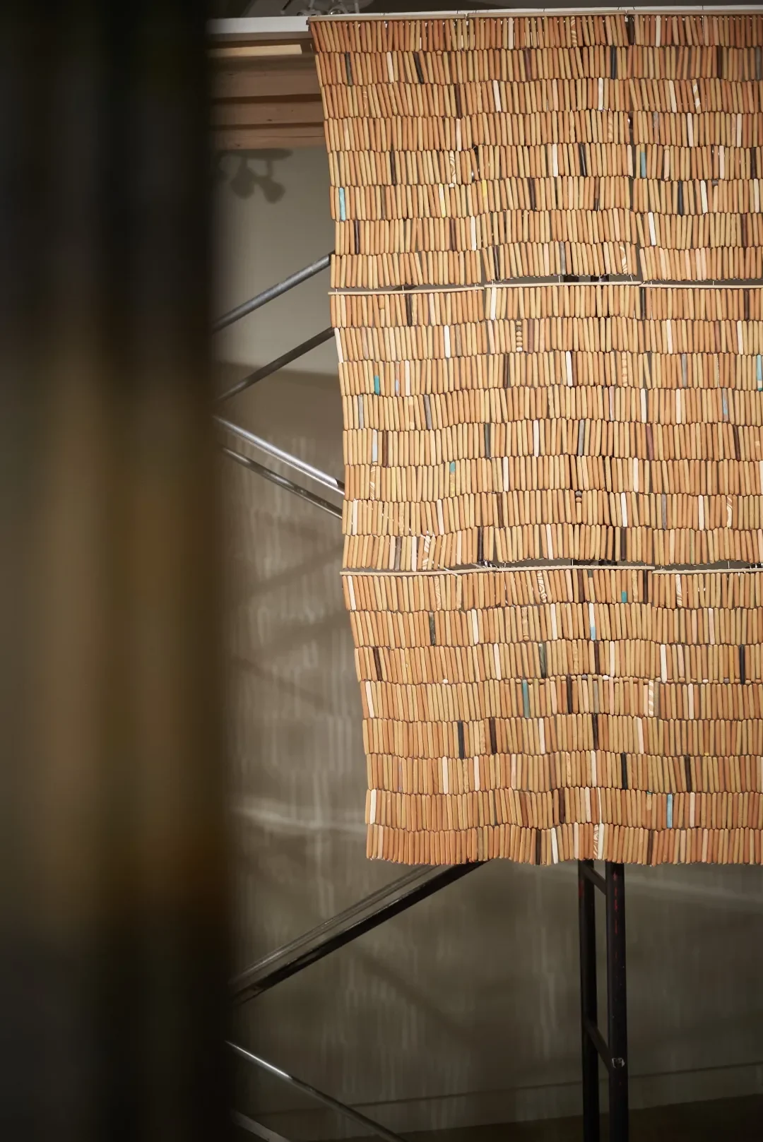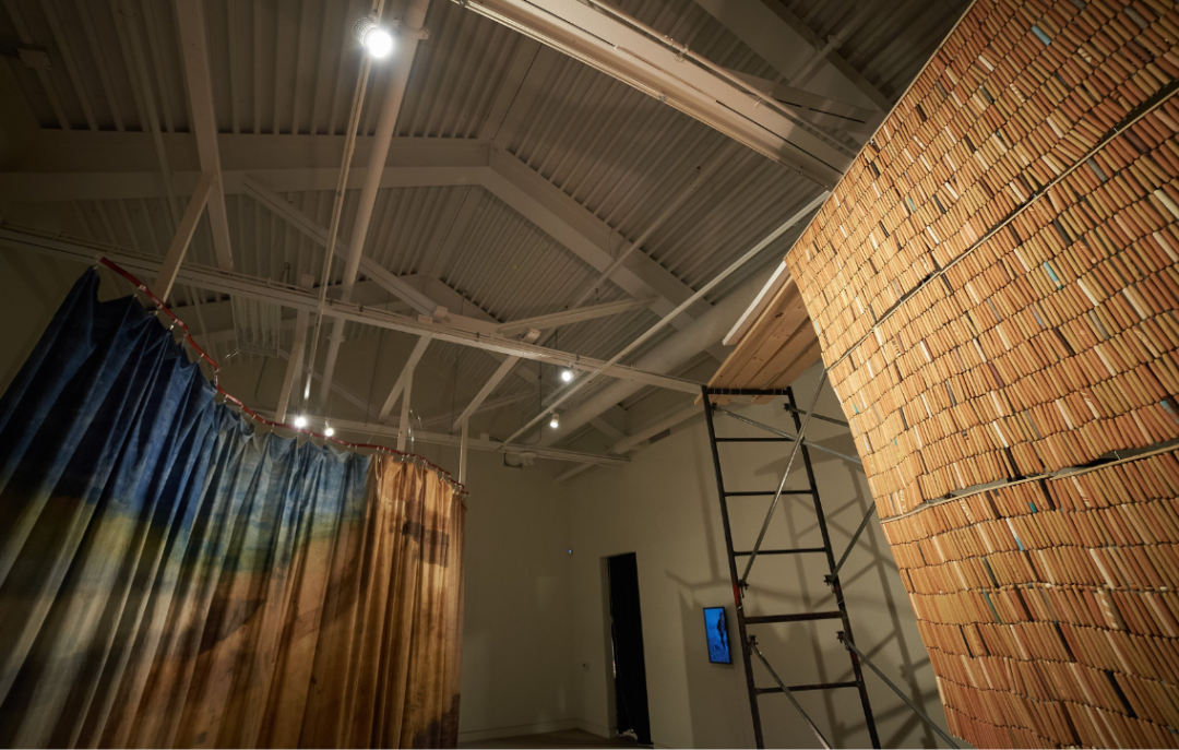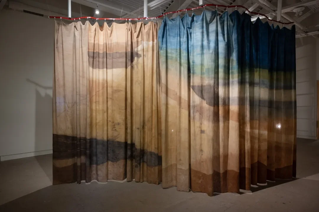 Carrying Distance is an exhibition of two curtains, a fabric one coloured with natural dyes and a ceramic one composed of thousands of handmade beads. Artist Abedar Kamgari reimagines curtains as symbolic manifestations of sites where multiple distances converge. By engaging embodied, tactile, and labour-intensive making processes, she reflects on contexts and conditions of displacement and diaspora. Her curtains gesture to borders shaped by geographical, cultural, linguistic, temporal, and gendered distances.
