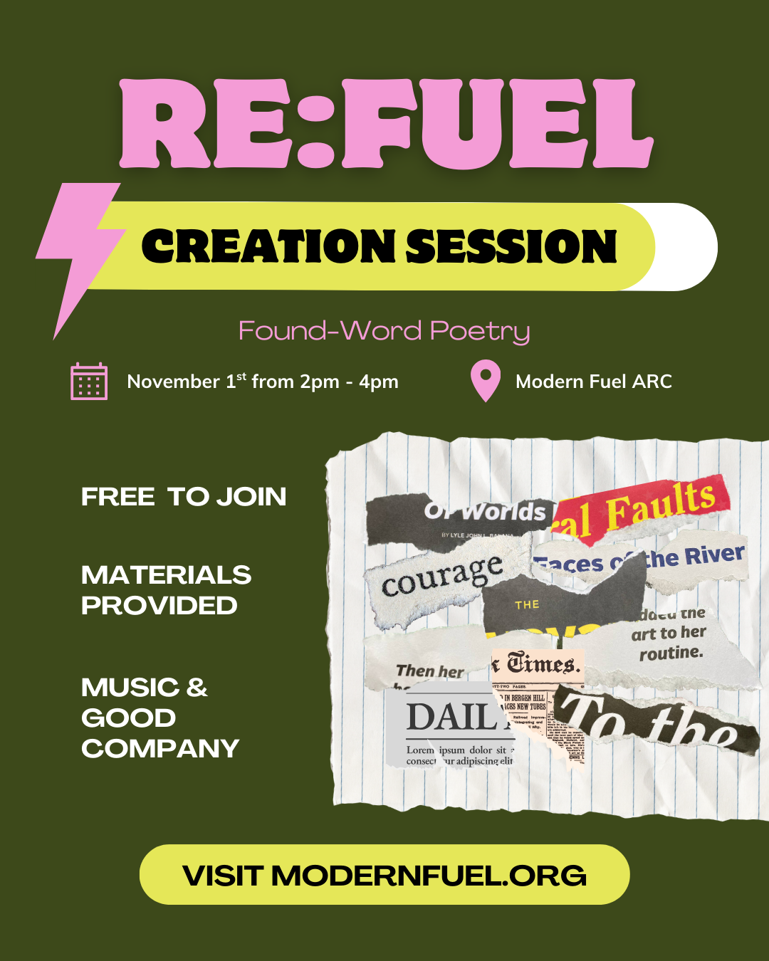 RE:FUEL - Creation Session Saturday, November 1, 2025 2:00 p.m. 4:00 p.m. Modern Fuel Artist-Run Centre 370 King Street West Kingston, ON, K7L 2X4 Canada (map) Google Calendar ICS