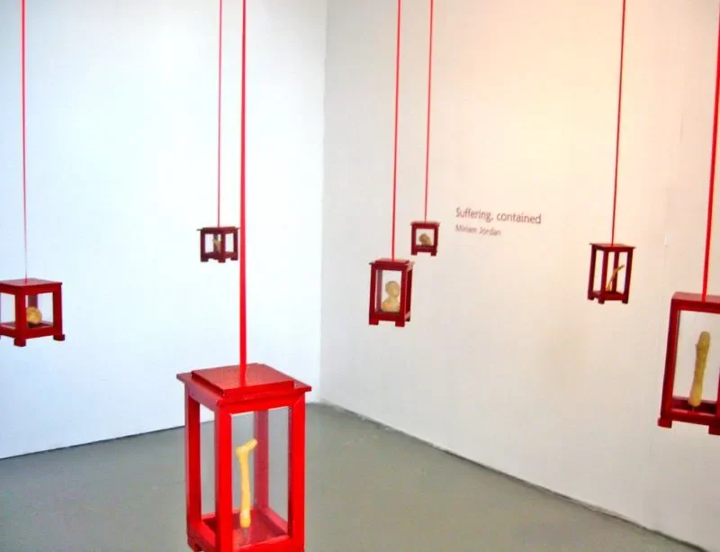 Presenting an installation of distorted and miniatured body parts from beeswax, contained in small red lacquered boxes, Jordan appreciates the grotesque nature of the work in that it is an attempt to control death through display: embodying the mannor in which we try to tame pain and cage death, in vain attempts to create a safe distance between us and its exquisite inescapability. Programmed according to conceptual connections with the theme ‘foreign states’.