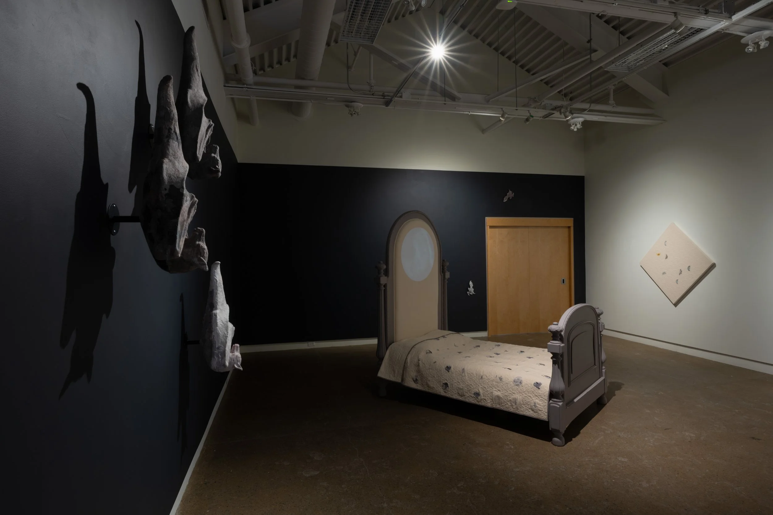 Sweet Dreams, the eponymous installation at the centre of the exhibition presents an intimate nocturnal scene featuring a video projection at the head of a quilt-covered double bed. The stop-motion animation video reproduces the panels of the lint-felted quilt atop the bed, which trace the progress of a bat catching and eating moths. Here Corkey articulates memories as nocturnal creatures: flittering bats recall intrusive thoughts, late nights tormented by ruminations of a moment past, doom spiraling. By contrast, the richly-patterned moths embody the delicacy of nostalgic memories. Both bear the muted tones and fuzzy, indeterminate edges of fading memories. The setting of this drama is notable, with the bed being both a place of comfort and of immense vulnerability. Corkey hints at memory’s ability to reassess and adapt itself through recall.