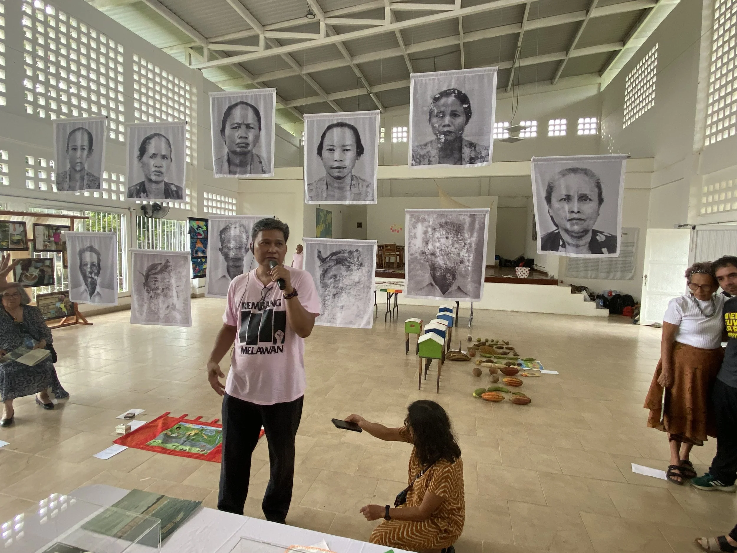I met Rangga Purbaya in Turbo, Colombia, where we both attended a MemoLab, an annual gathering hosted by the Transformative Memory International Network. In Turbo, community leaders, Indigenous representatives, artists, scholars, students, and survivors of mass violence from Canada, Chile, Uganda, and Indonesia met under the theme of Embarcase: Ports, Flows, and the Undercurrents of Memory. Rangga’s portraits hung in the middle of a wider art exhibit, activated through conversation with other artworks, the breeze, and the exchange of voices and dance through the room.